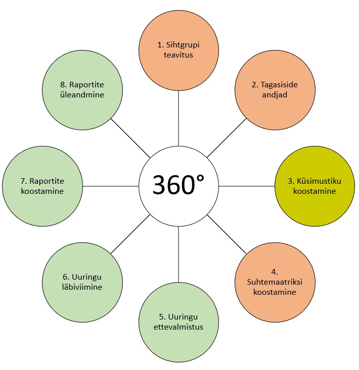 Tagasiside kogumine eeldab tihedat koostööd konsultandi ja uuringu tellinud organisatsiooni vahel – eesmärgiks on saada tagasiside raportid, mis annaksid sisendit ja tõuget enesearenguks. 360° tagasiside hindamise protsessis konsultandi (roheline) ja tellija-organisatsiooni (oranz) ülesanded.